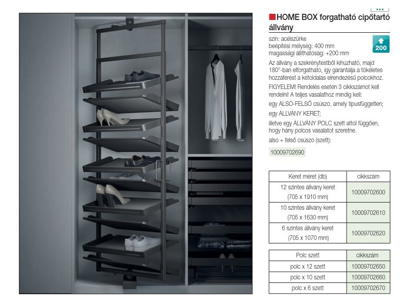 A cipőtartó állvány a szekrénytestből kihúzható, majd 180 fokban elforgatható, így garantálja a tökéletes hozzáférést a kétoldalas elrendezésű polcokhoz.