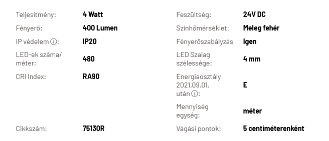 LED Szalag beltéri 24V, 4 Watt, 4 mm COB/480 LED, ~400 Lumen, 2800-3200K (meleg fehér)