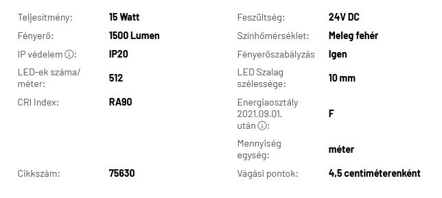 LED Szalag beltéri 24V, 15 Watt, 10 mm COB/512 LED, ~1500 Lumen, 2800-3200K (meleg fehér)