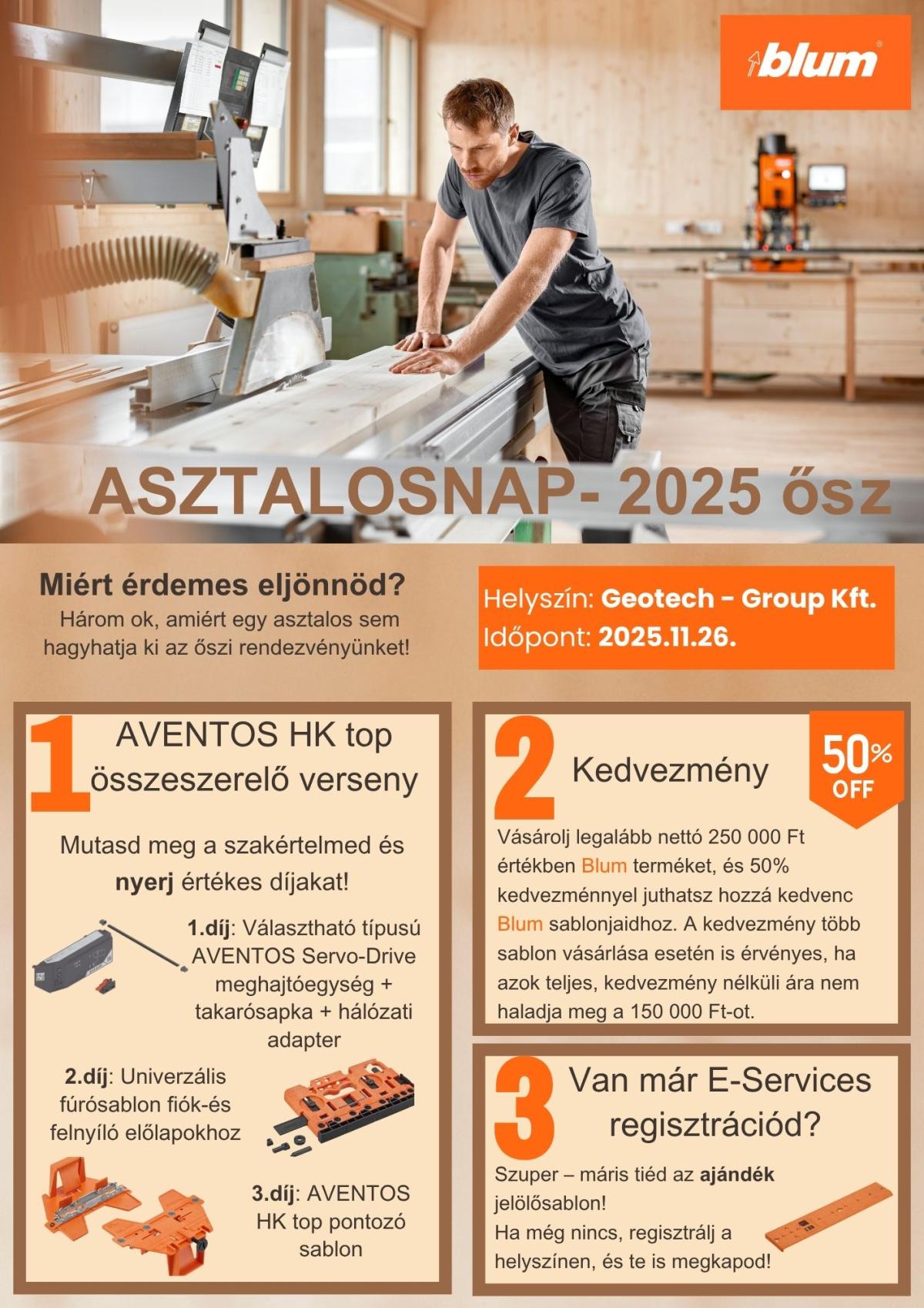 A Blum idén is megrendezi az egyik legfontosabb szakmai eseményt, amely minden asztalos és bútoripari szakember számára valódi értéket kínál. Ha minőségben dolgozol, ha fontos számodra a fejlődés, és szeretnél első kézből találkozni a legújabb Blum megoldásokkal, akkor ezt a napot érdemes beírnod a naptáradba.